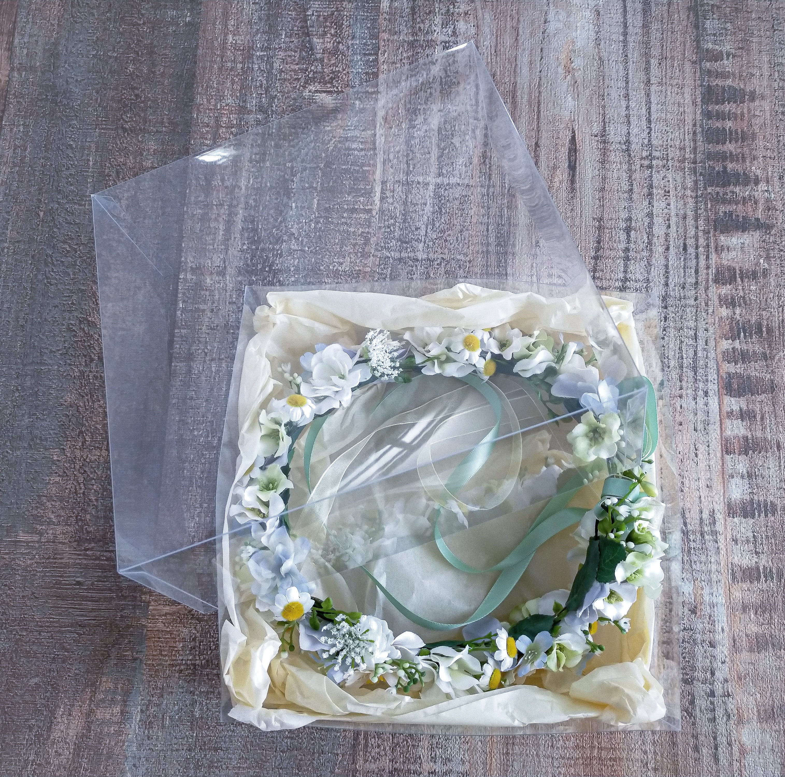 ご購入頂いた花冠を高品質のクリスタルボックスにお入れしてお届けします。