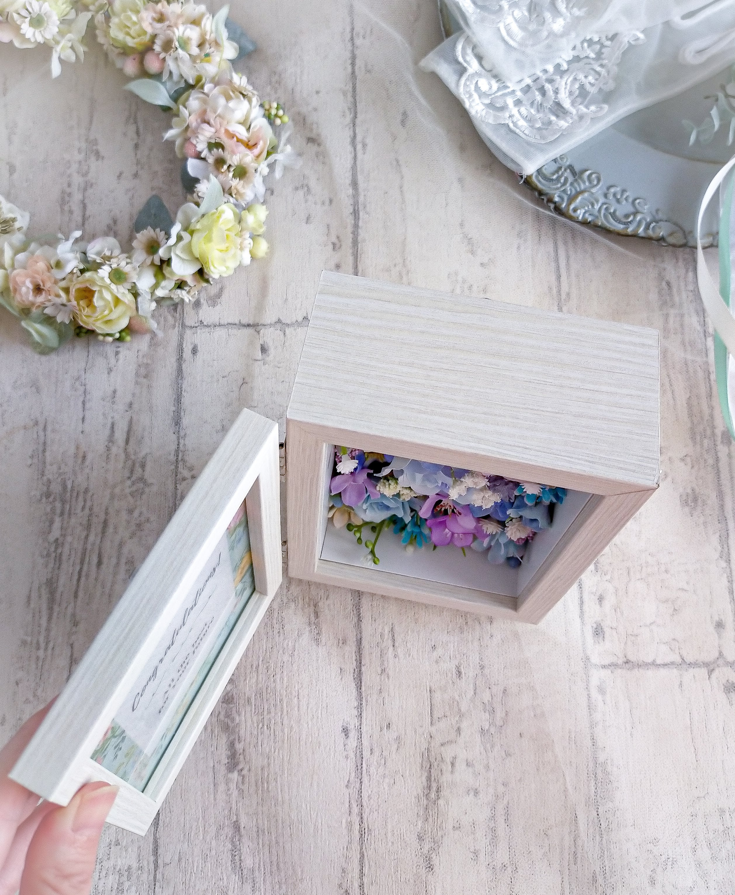 水色&優しいパープルのお花を散りばめたフラワーBOXフォトフレームです。お花は全て高品質な造花を使用しているため、末永く綺麗なまま咲き続けます。